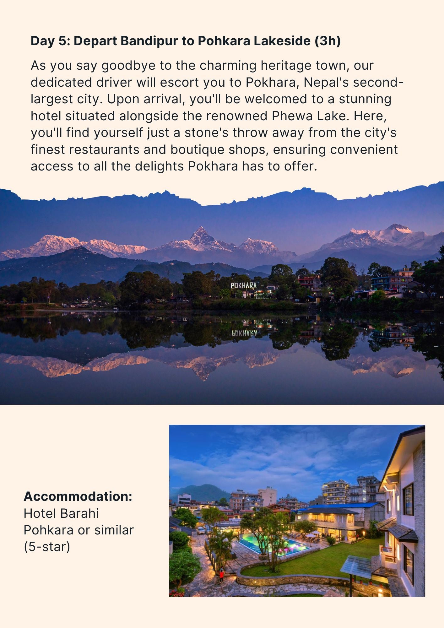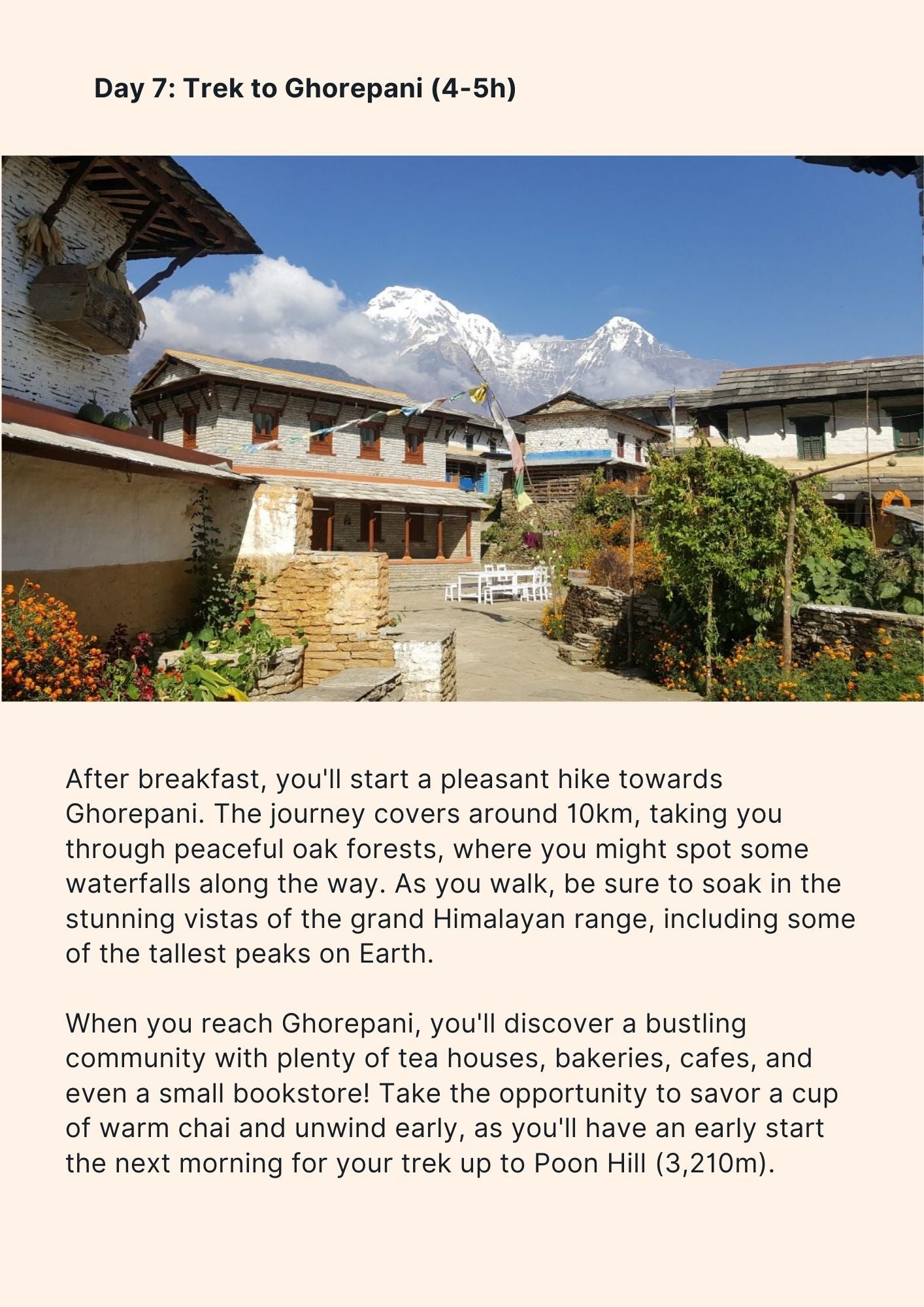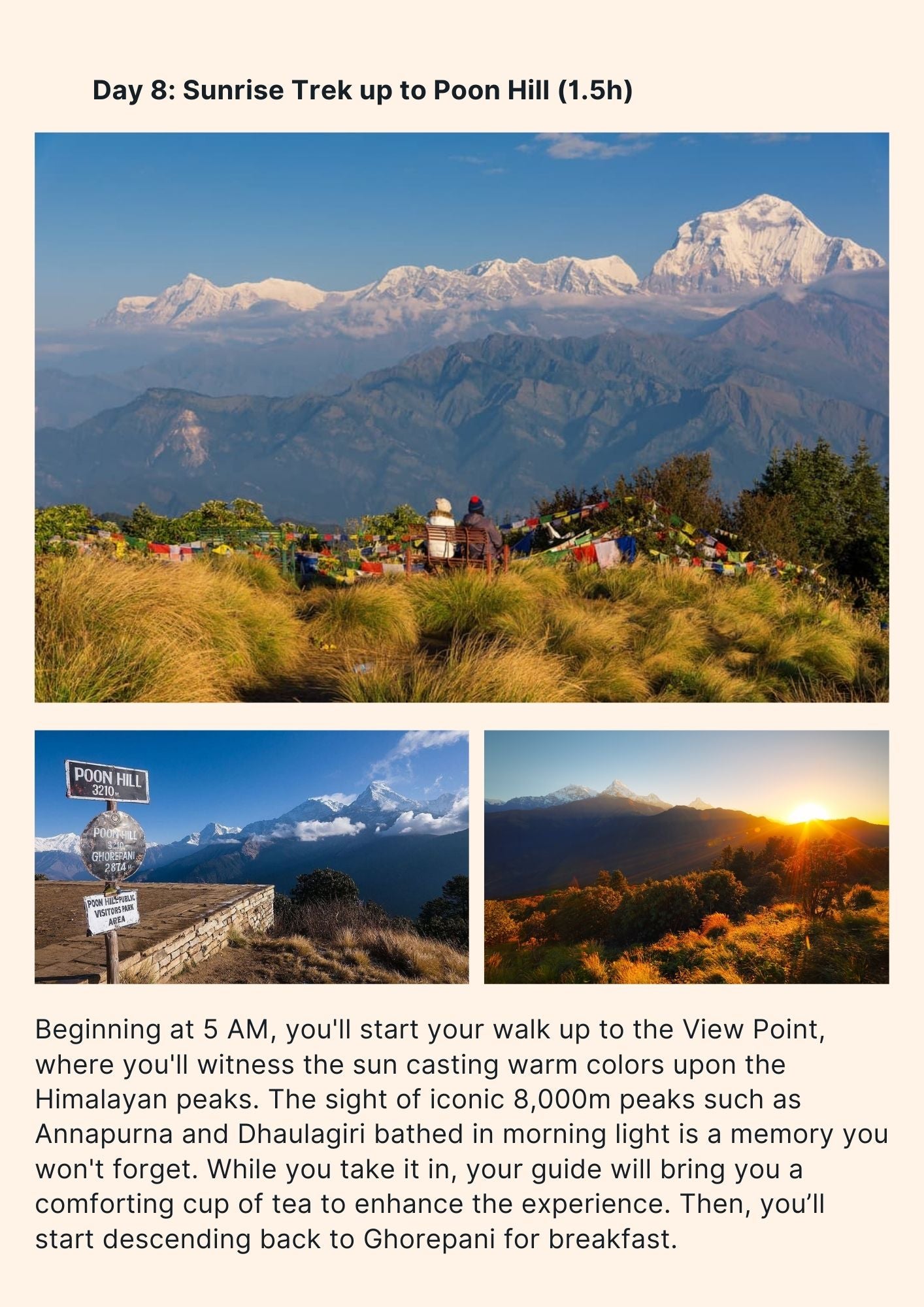 After your serene stay in Bandipur, head to Pokhara, Nepal's second-largest city, before embarking on a three-day beginner-friendly trek in the Annapurna conservation region. Accompanied by your own personal guide and porter, you'll witness breathtaking sunrise views from a vantage point overlooking some of the world's tallest peaks, creating unforgettable memories to cherish forever.