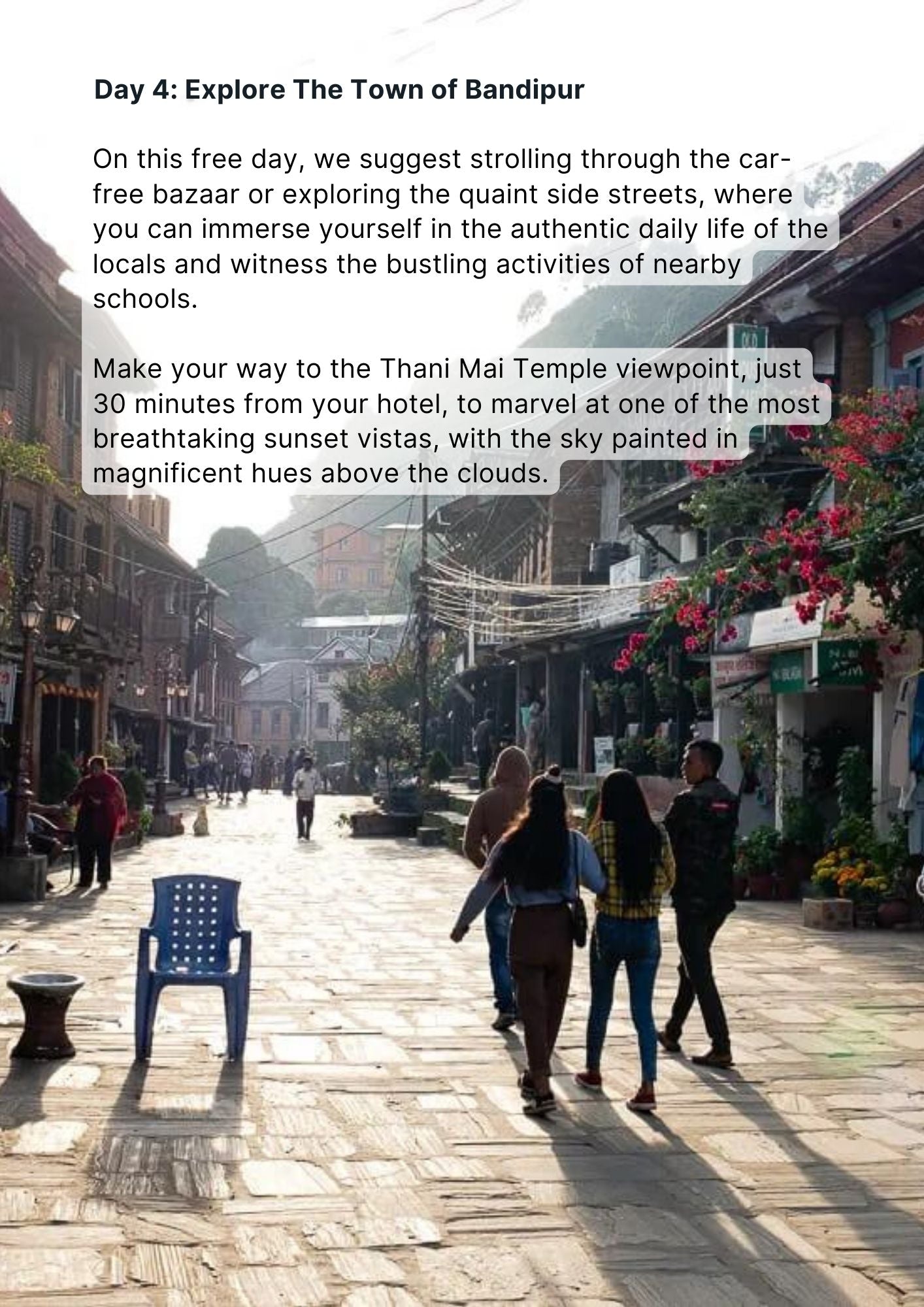 Next, venture three hours westward to the quaint Newari town of Bandipur, a hidden gem nestled in Nepal's heart. Here, spend two nights atop a hillside settlement, exploring temples, wandering charming streets, and embracing a relaxed pace reminiscent of times past. Some say it feels like strolling through a European village, with its old-world charm.