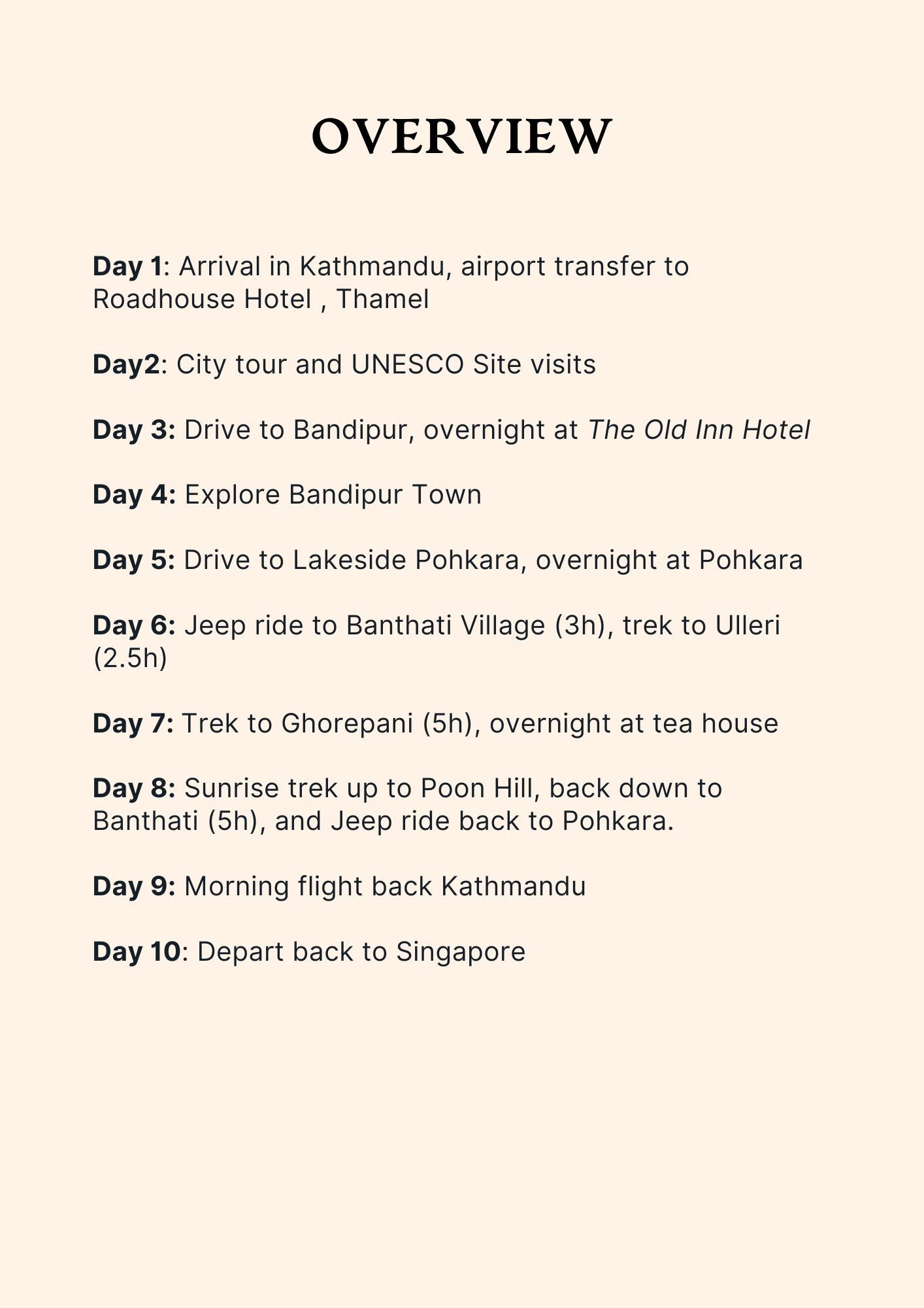 We break down your daily activity schedule to provide you with a clear understanding of what to anticipate on this 10 day adventure.