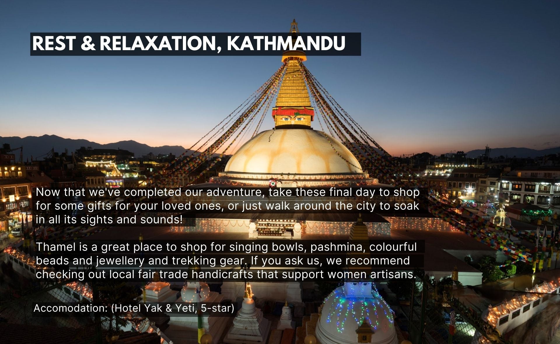In Kathmandu, our team has partnered with top-rated hotels located in prime areas, guaranteeing comfort and premium services throughout your stay. On the trek, we ensure the best available tea houses, plus 2 days of wildness camping. All accommodations are twin-sharing by default, though single occupancy can be arranged upon request for an additional fee.